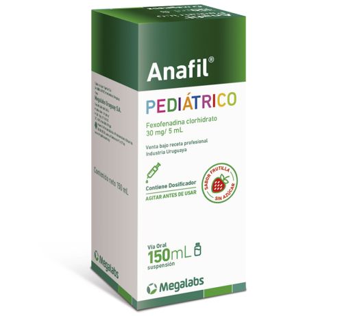 Anafil Pediatrico, Megalabs- Rowe, Susp x 150 ml, fexofenadina 30 mg/5 ml. Sabor frutilla, sin azúcar. Antialérgico. Antihistamínico H1 de segunda generación. Antagonista selectivo de los receptores periféricos de histamina H1. Posee escasa distribución en el SNC y por lo tanto mínimo efecto sedante. Carece de efecto anticolinérgico. Metabolito activo de la terfenadina. Inicio de acción 1-3 h, duración 12 h.