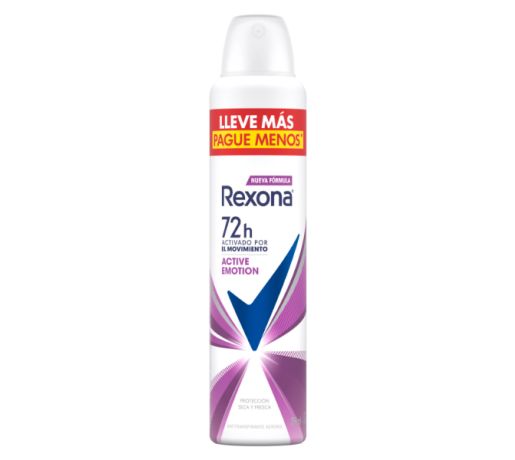 El desodorante en aerosol Rexona Active Emotion te brinda 72 horas de protección contra la transpiración y el mal olor, manteniéndote seca, fresca y protegida incluso en los días más estresantes. Su tecnología MotionSense se activa con el movimiento, liberando frescura y protección inmediata.
